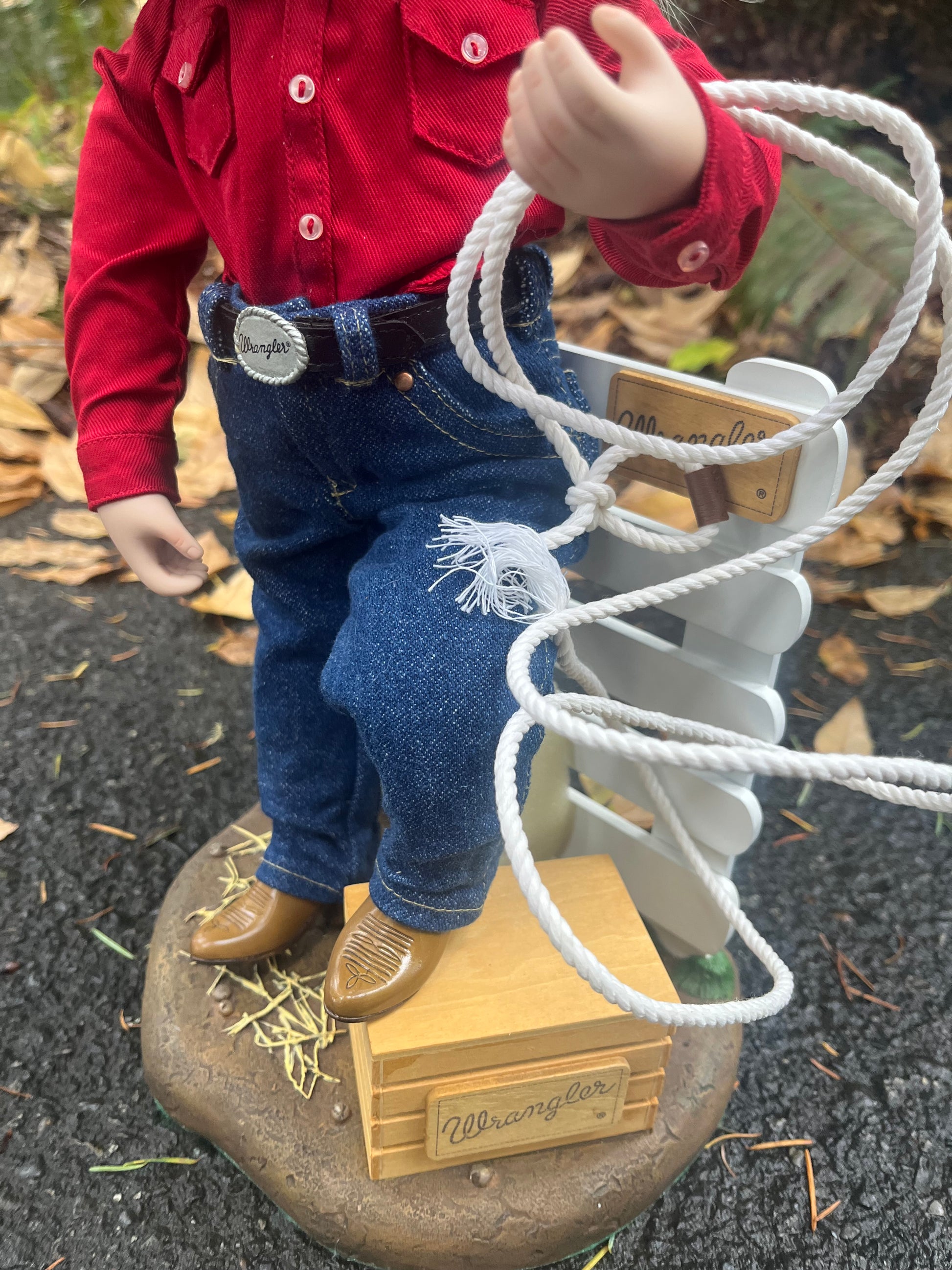 This lil wrangler comes with fence post stand. Mummified head, doll body.
