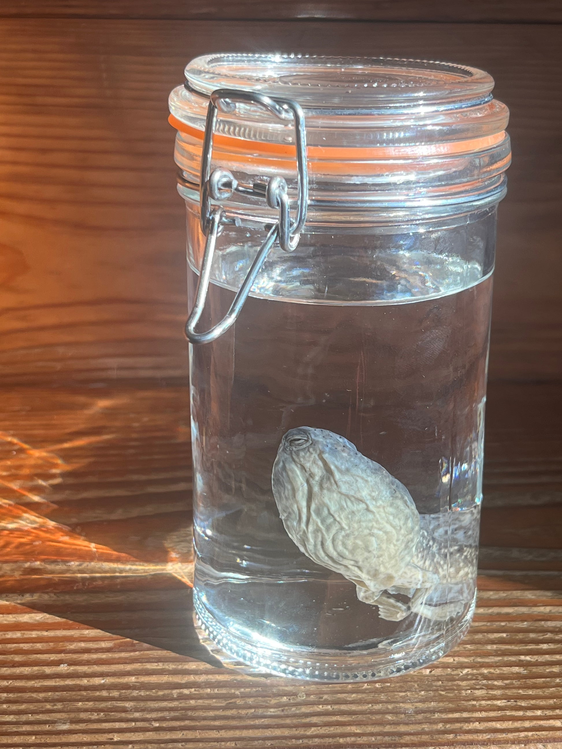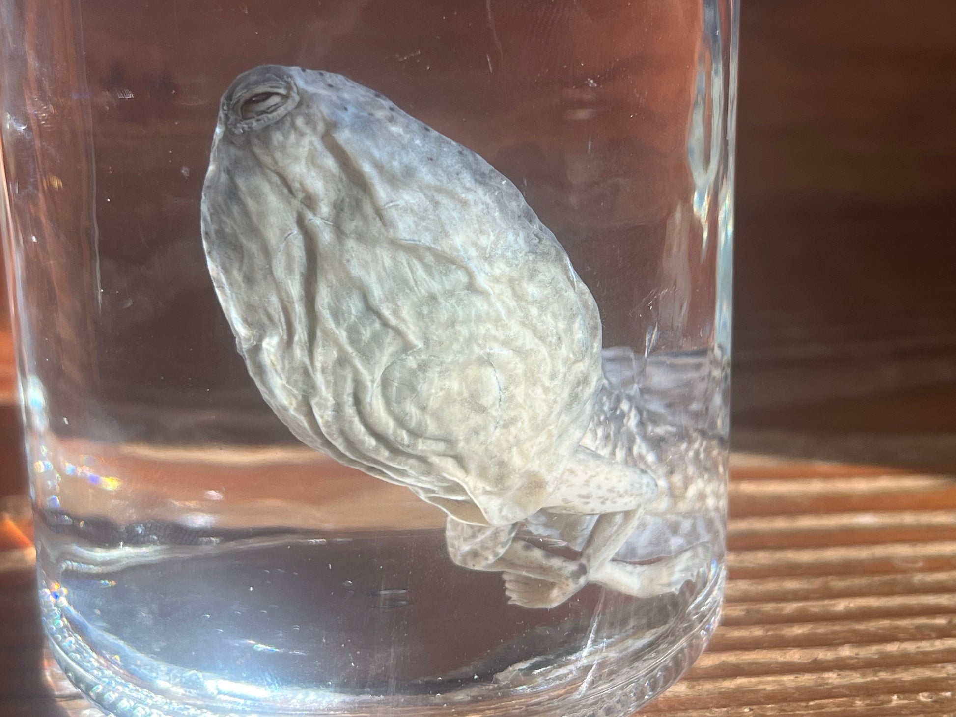 Lithobates catesbeianus American Bullfrogs are an invasive species. This tadpole ships with jar, but without alcohol. Specimen has been scientifically preserved. Buyer must fill jar with 70% isopropyl alcohol upon arrival, this specimen is for display only and intended for educational purposes. Jar is approximately 3.5”x6” |