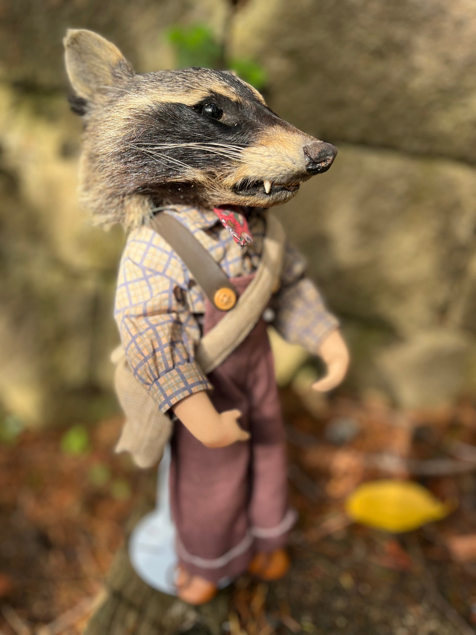 This raccoon doll is sporting bell bottoms.:) stands 14.5” |