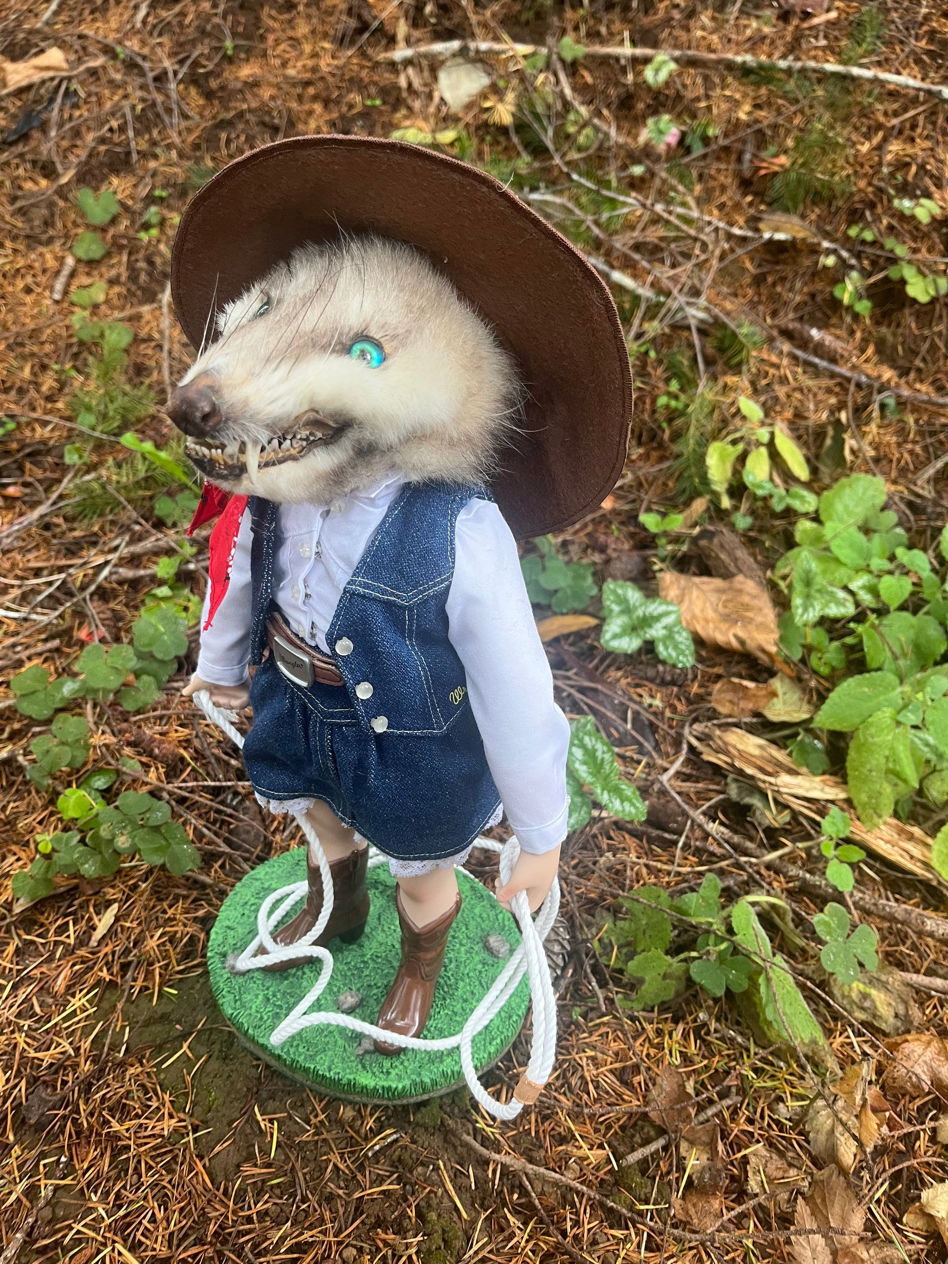 This opossum is ready to wrangle! Mummified opossum head, doll body. Stands |