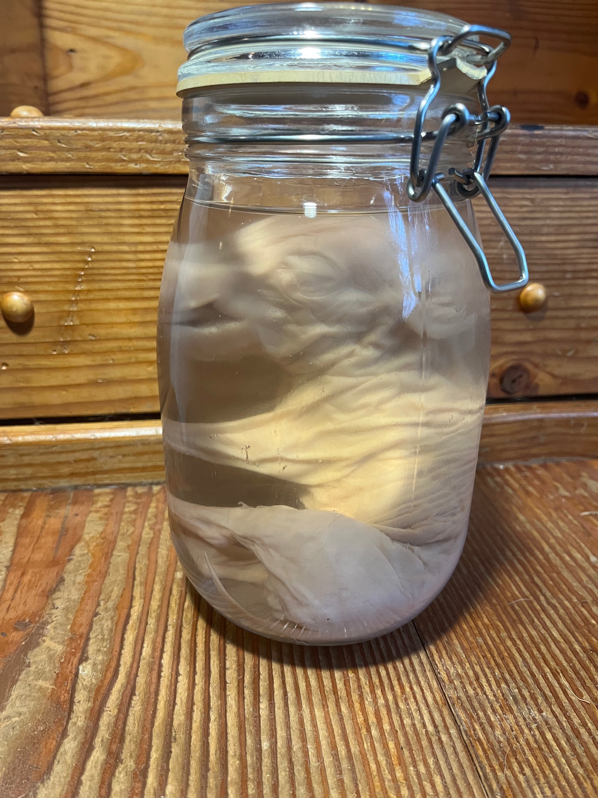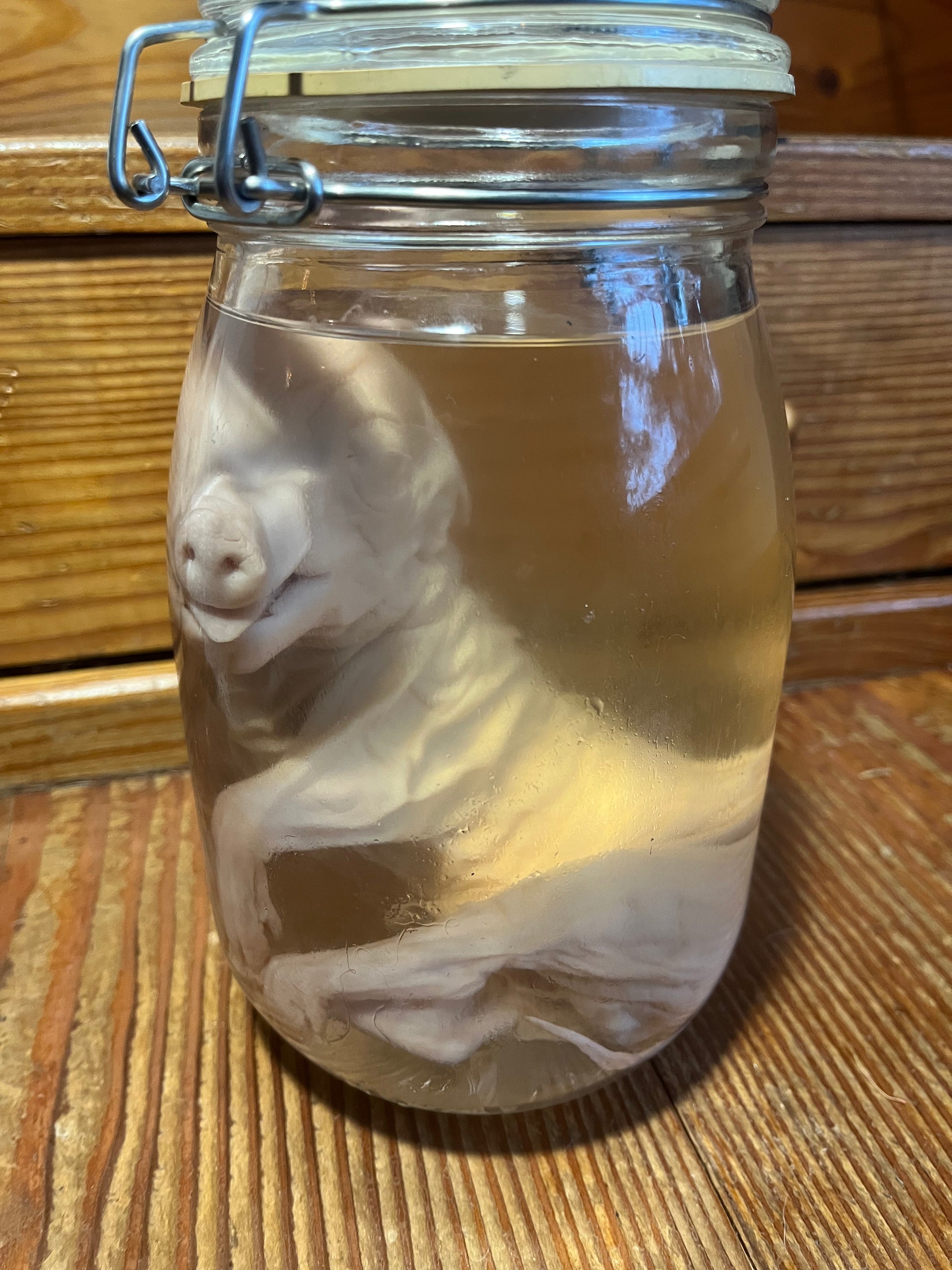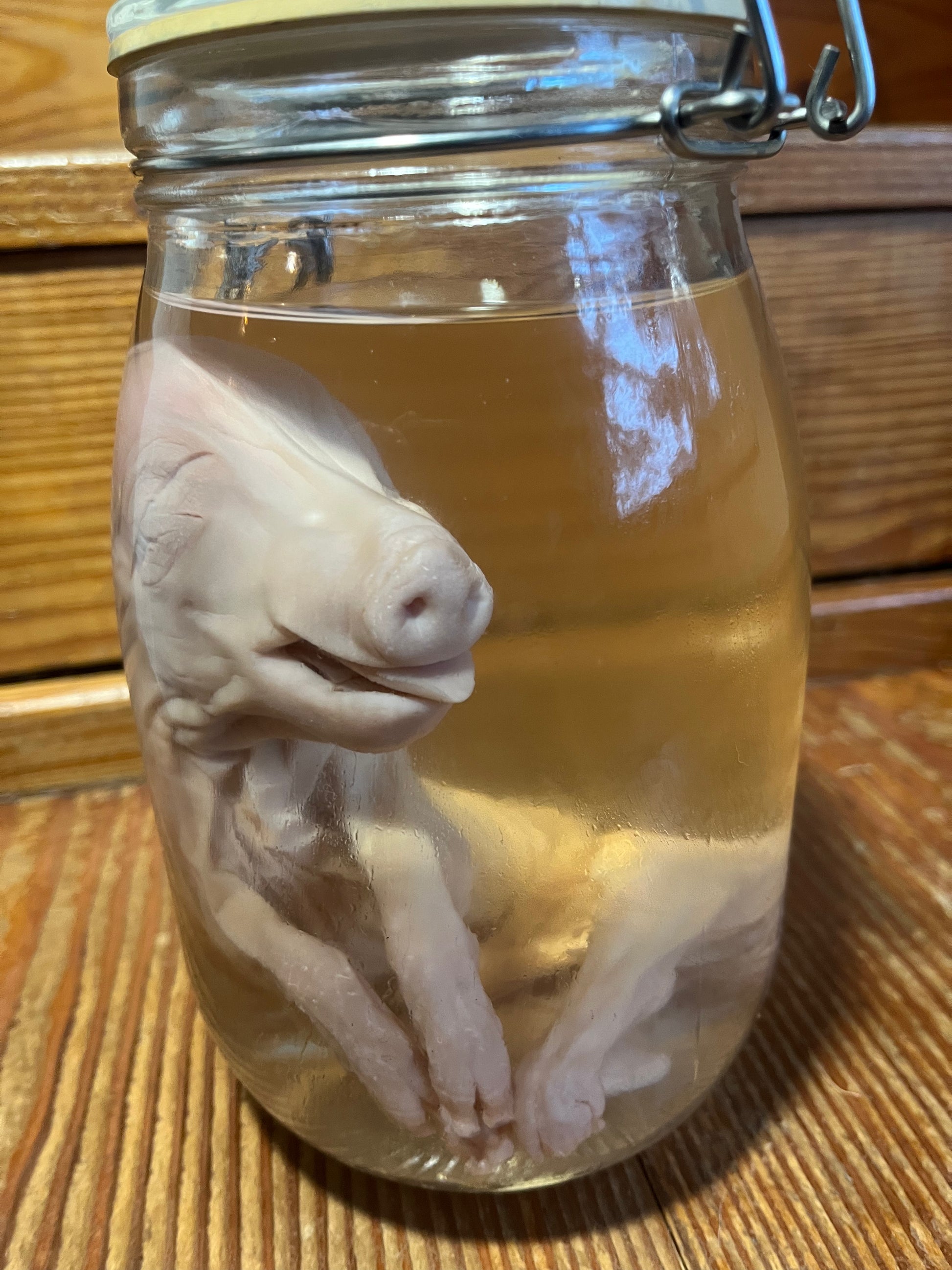 Jar is 8” tall. Formalin fixed Specimen ships with jar, but without fluid. Buyer must fill jar with 70% isopropyl alcohol upon arrival. For display only.