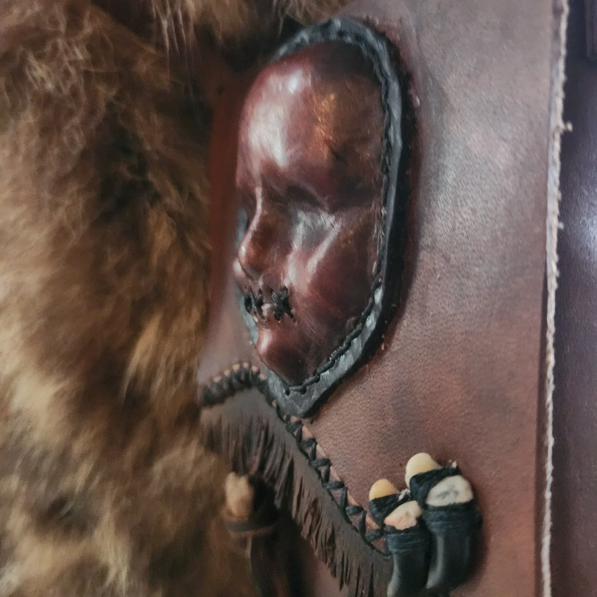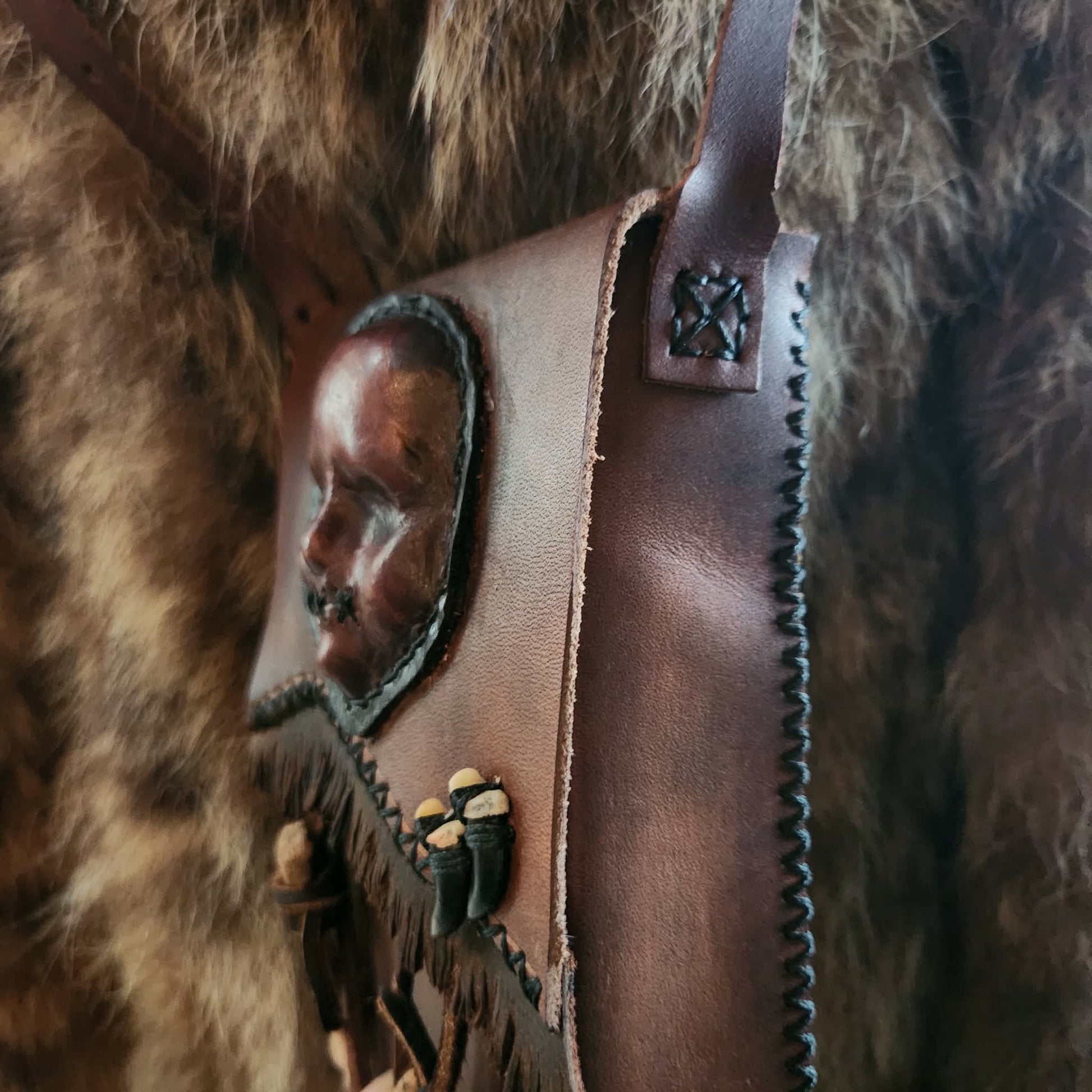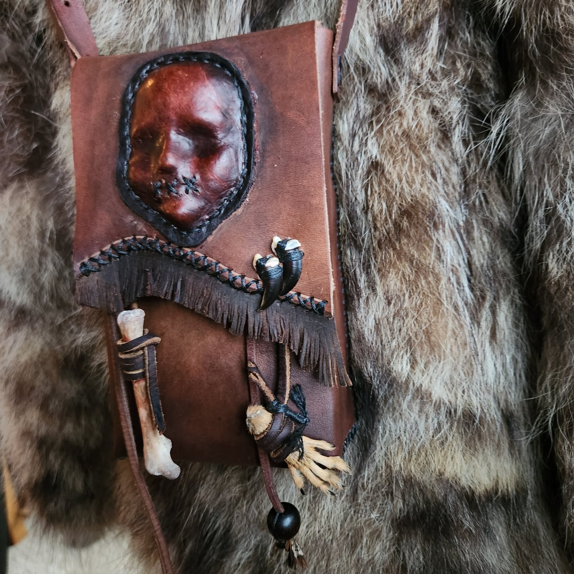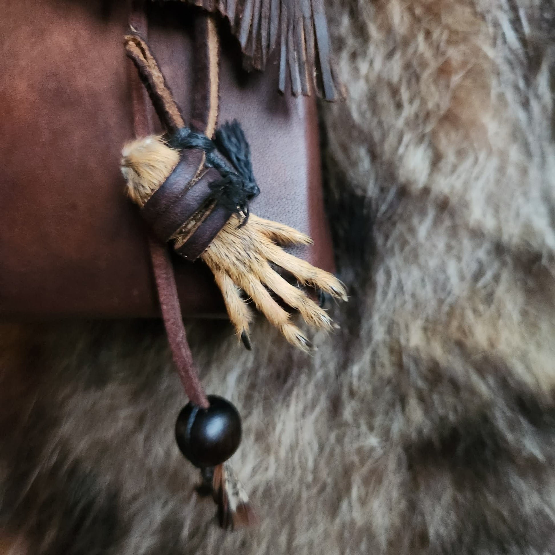 Number 4 in our Soul Catcher series. Veg tanned leather cross body bag. Incorporated the soul of a haunted porcelain doll, coyote claws, squirrel foot and foraged bones. 4”x7”