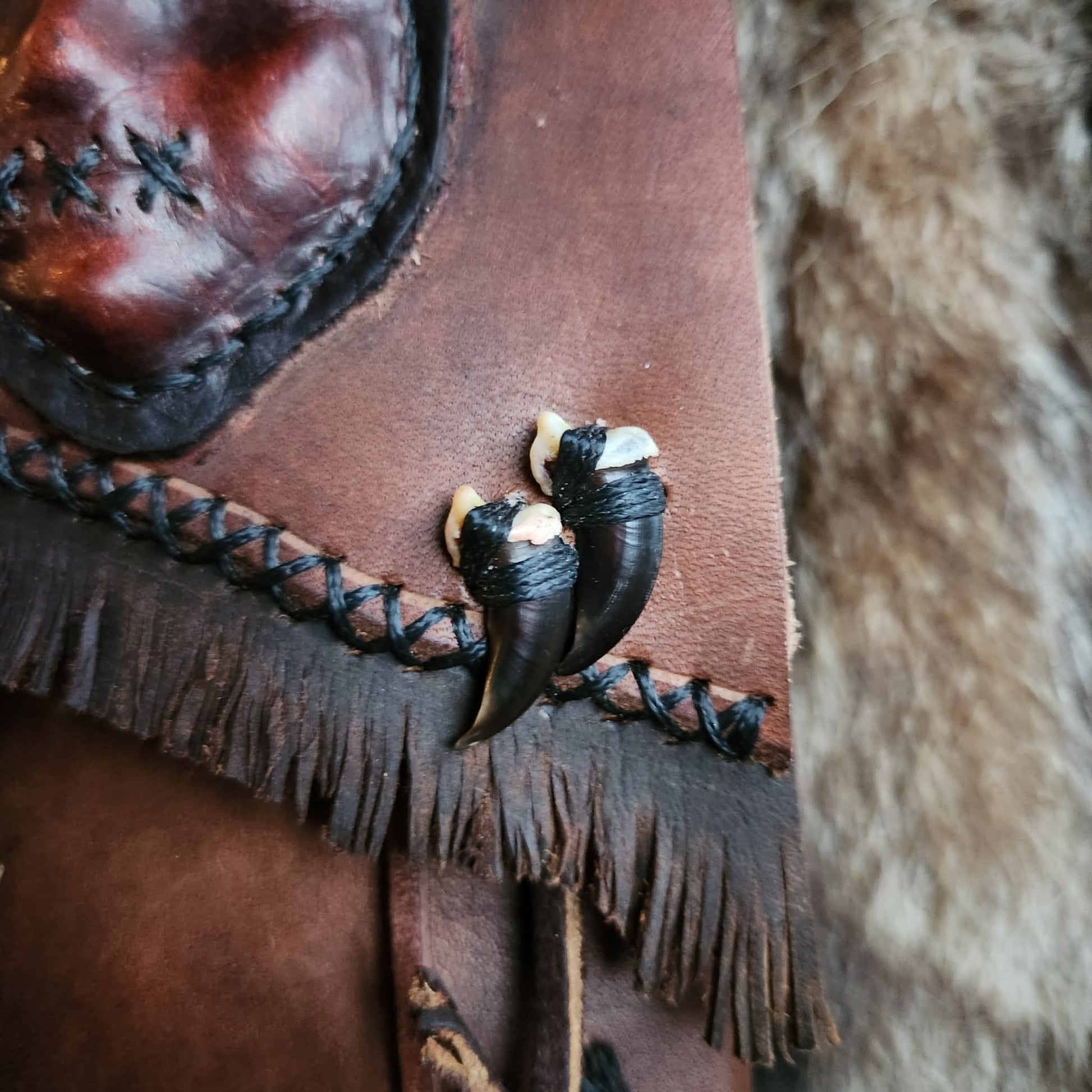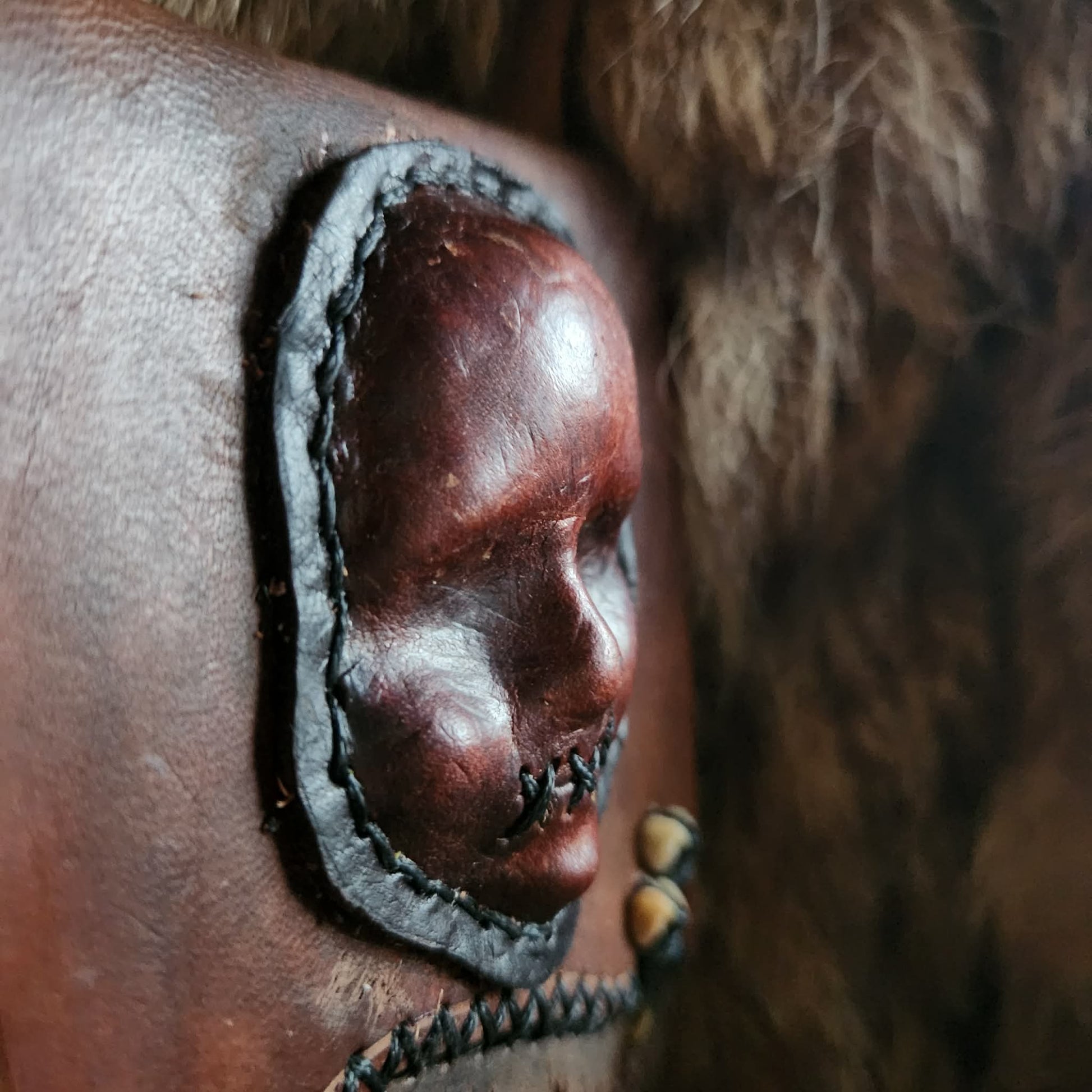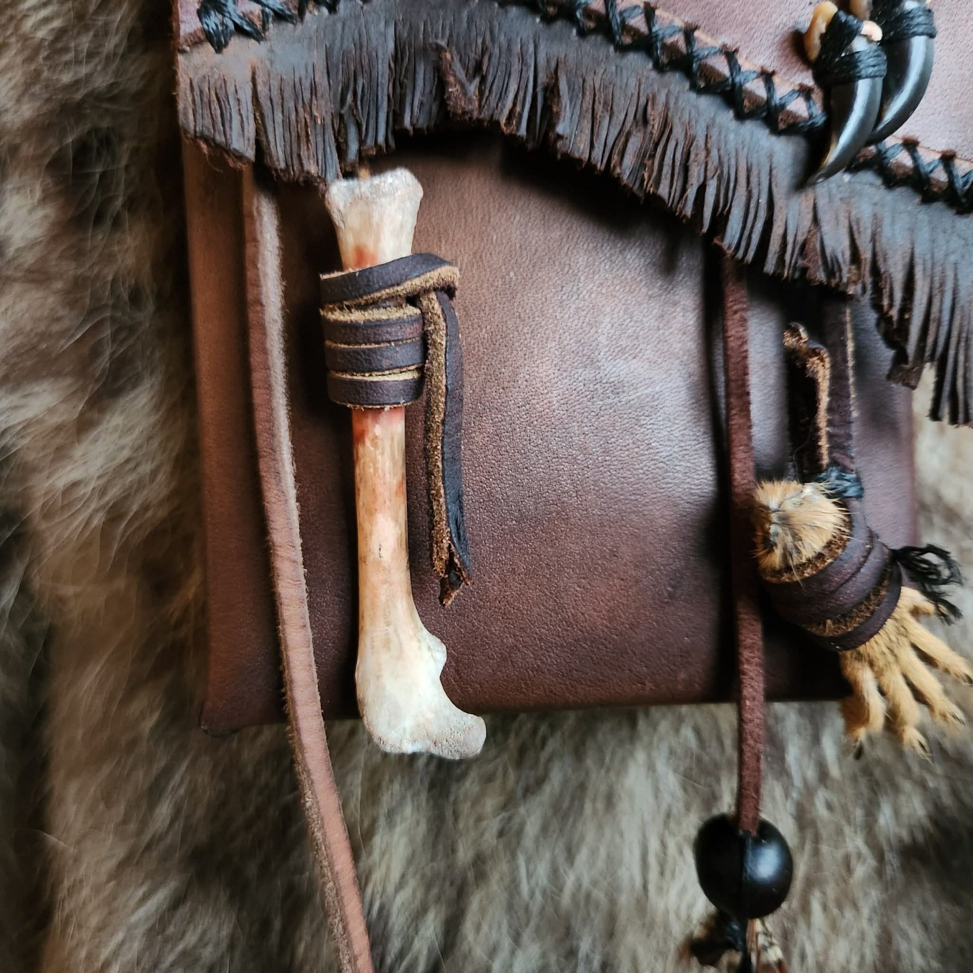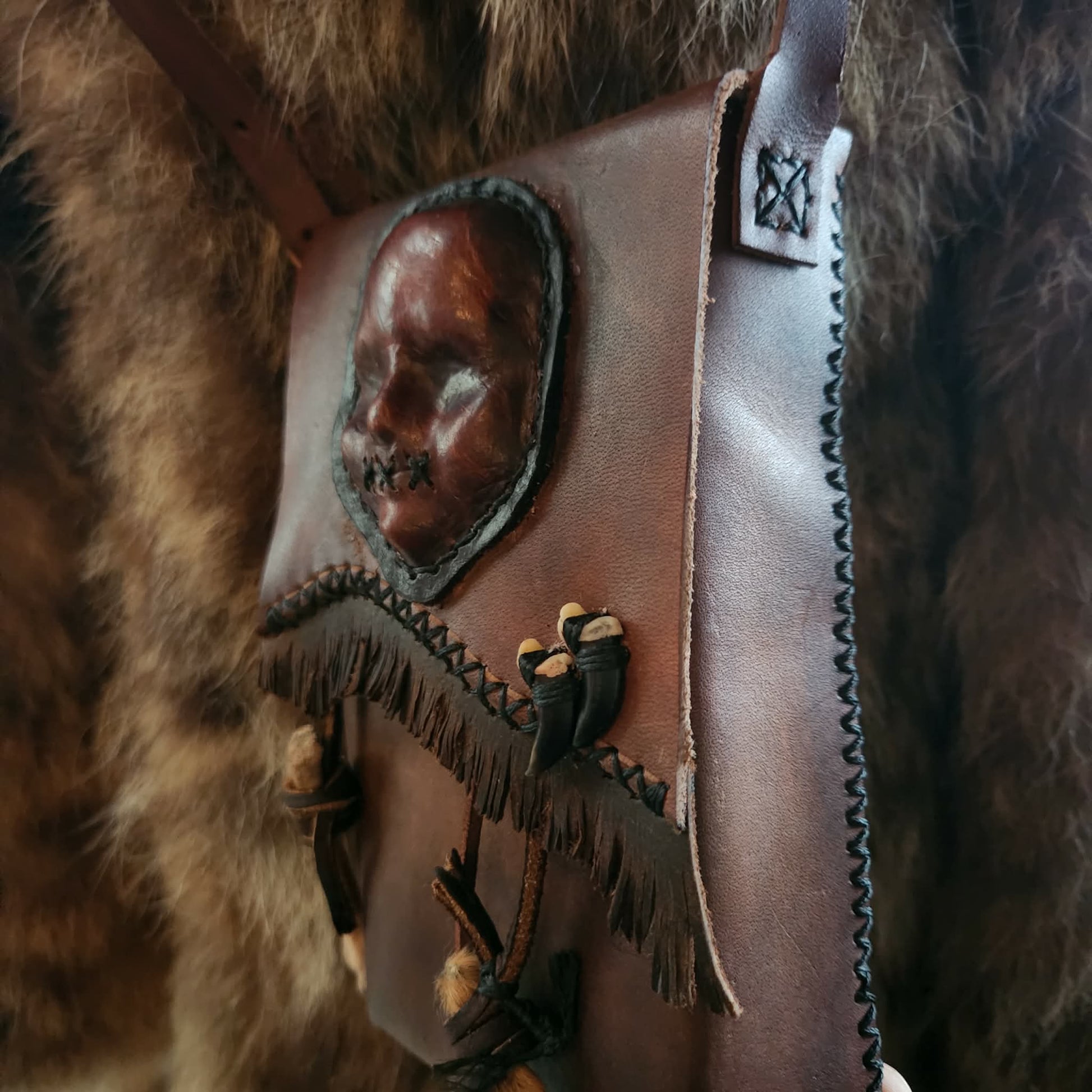 Number 4 in our Soul Catcher series. Veg tanned leather cross body bag. Incorporated the soul of a haunted porcelain doll, coyote claws, squirrel foot and foraged bones. 4”x7”
